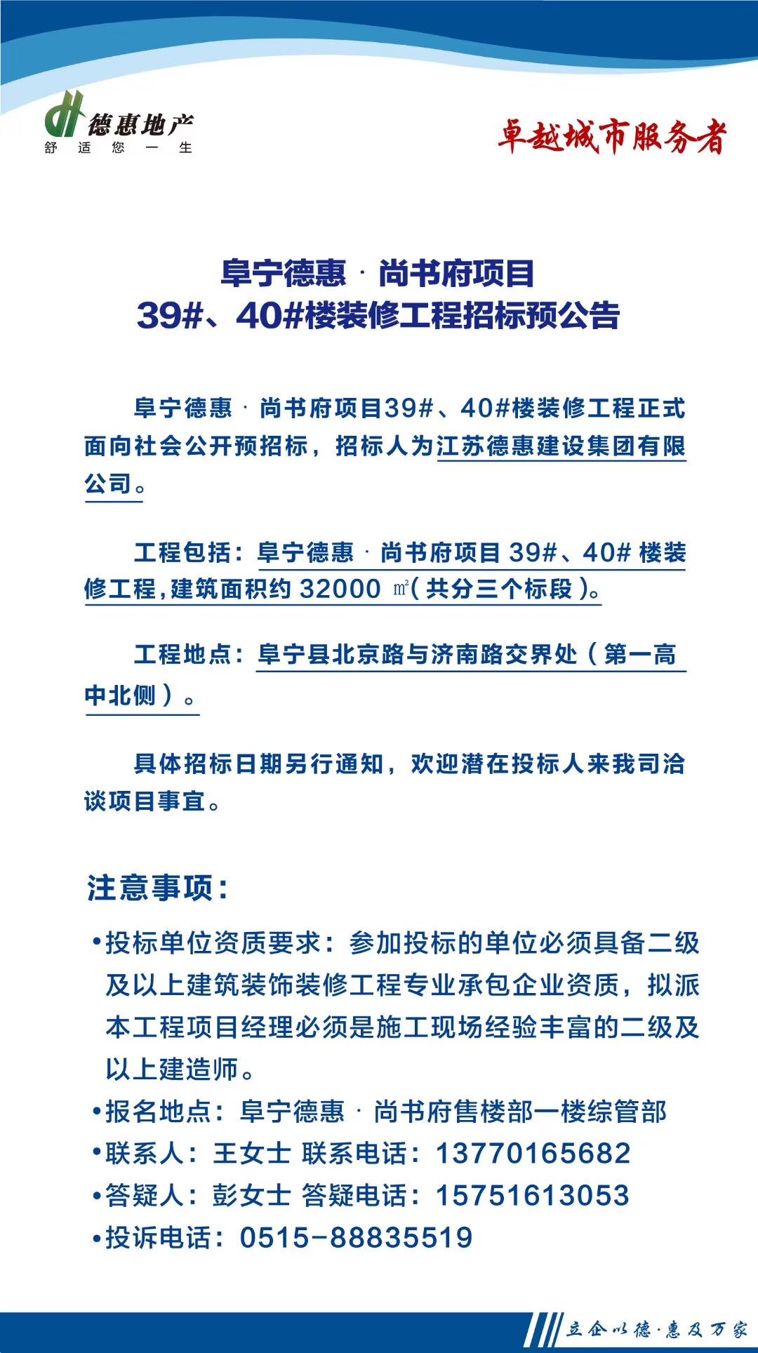 阜宁德惠·尚书府项目39#、40#楼装修工程招标预公告
