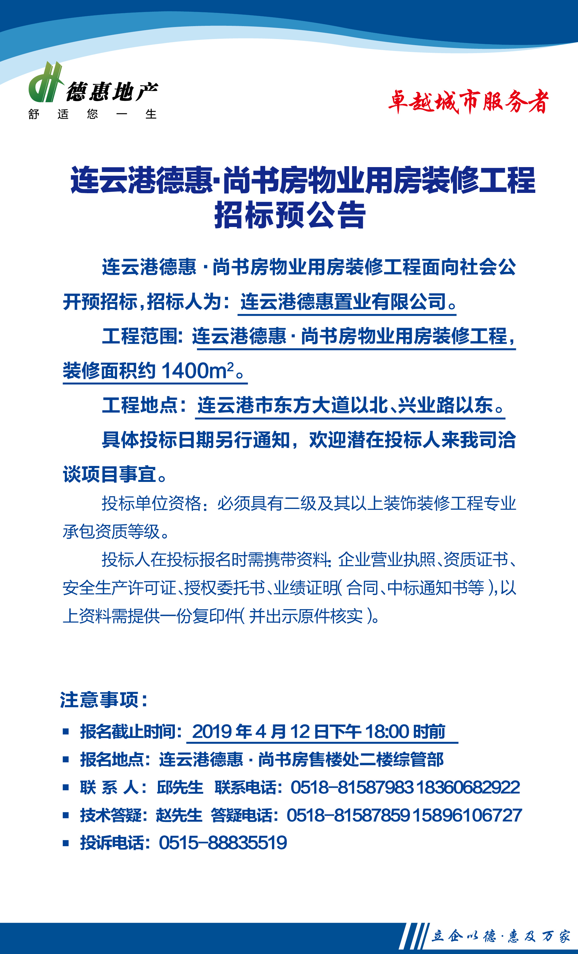连云港德惠·尚书房物业用房装修工程招标预公告