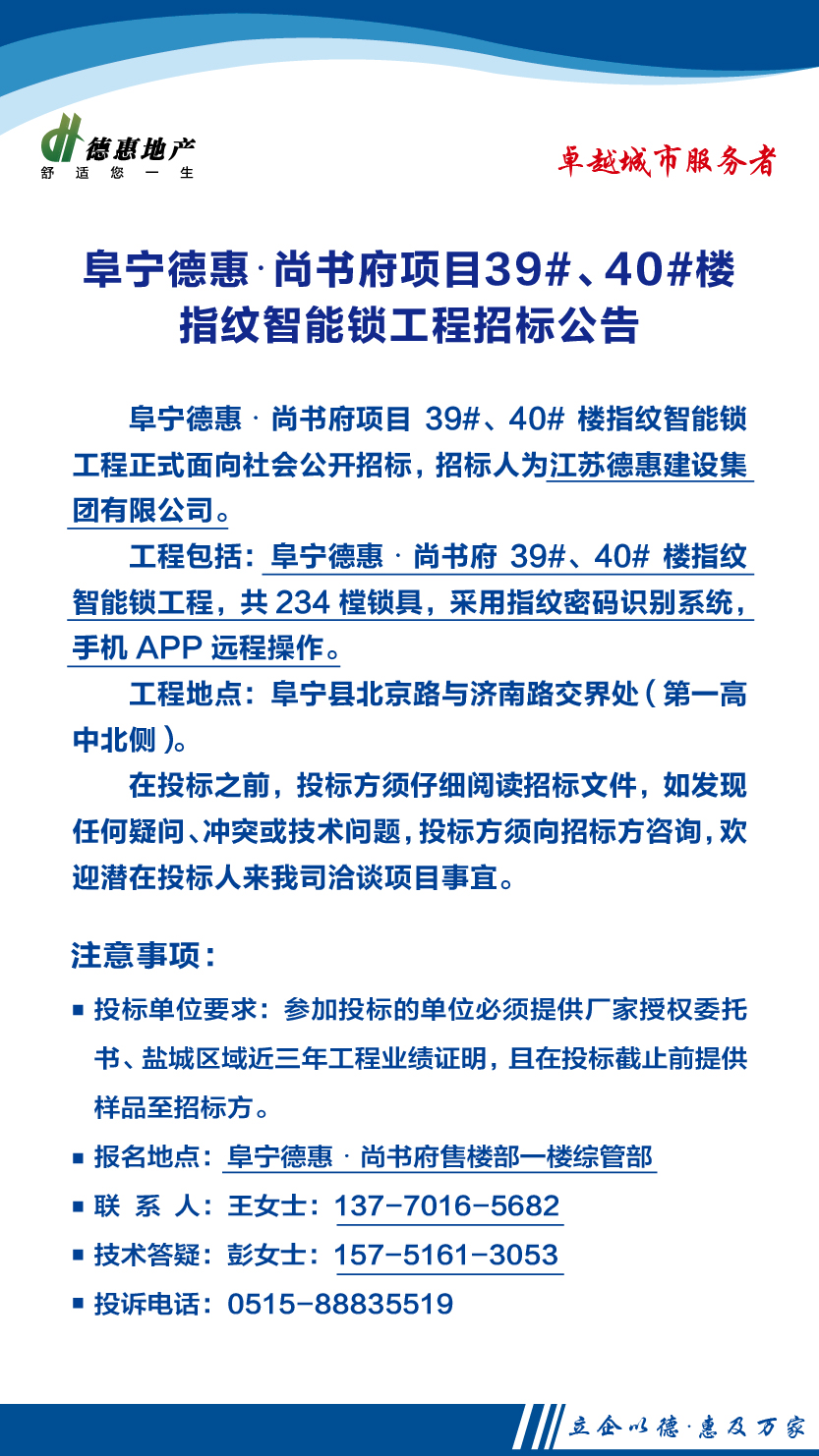 阜宁德惠·尚书府项目39#、40#楼指纹智能锁工程招标公告