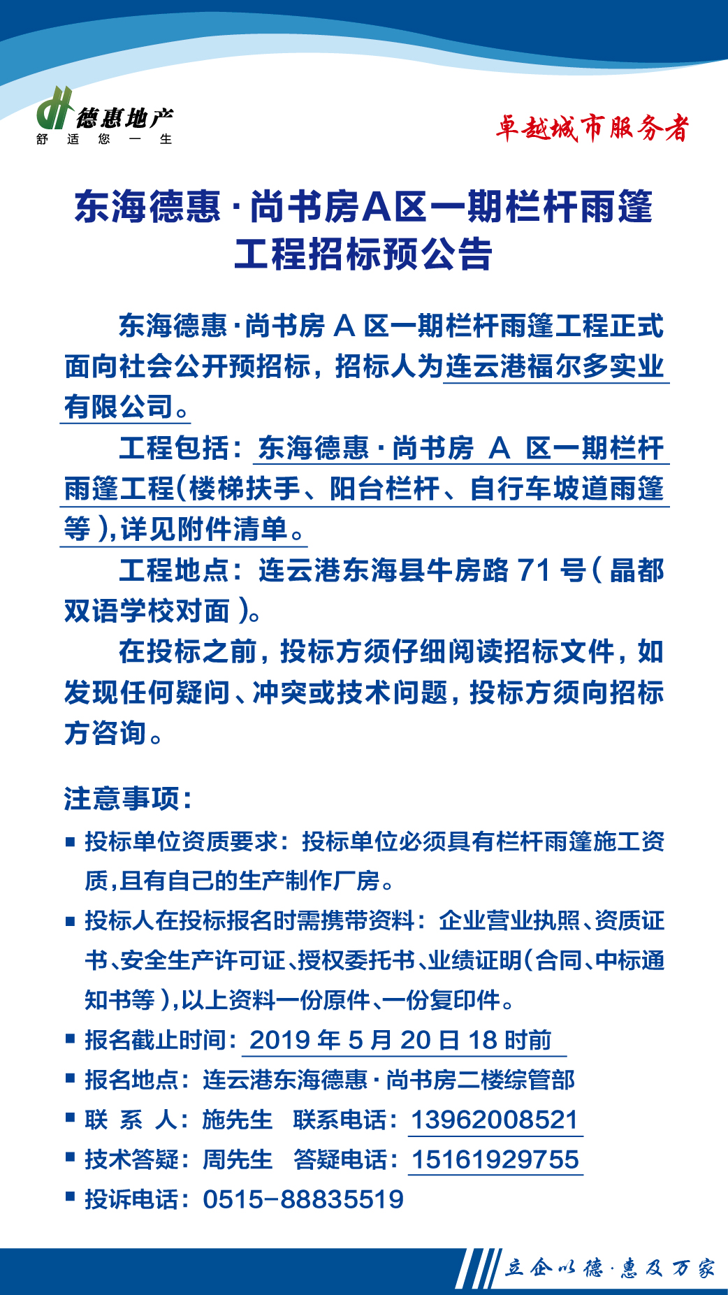 东海德惠·尚书房A区一期栏杆雨蓬工程招标预公告