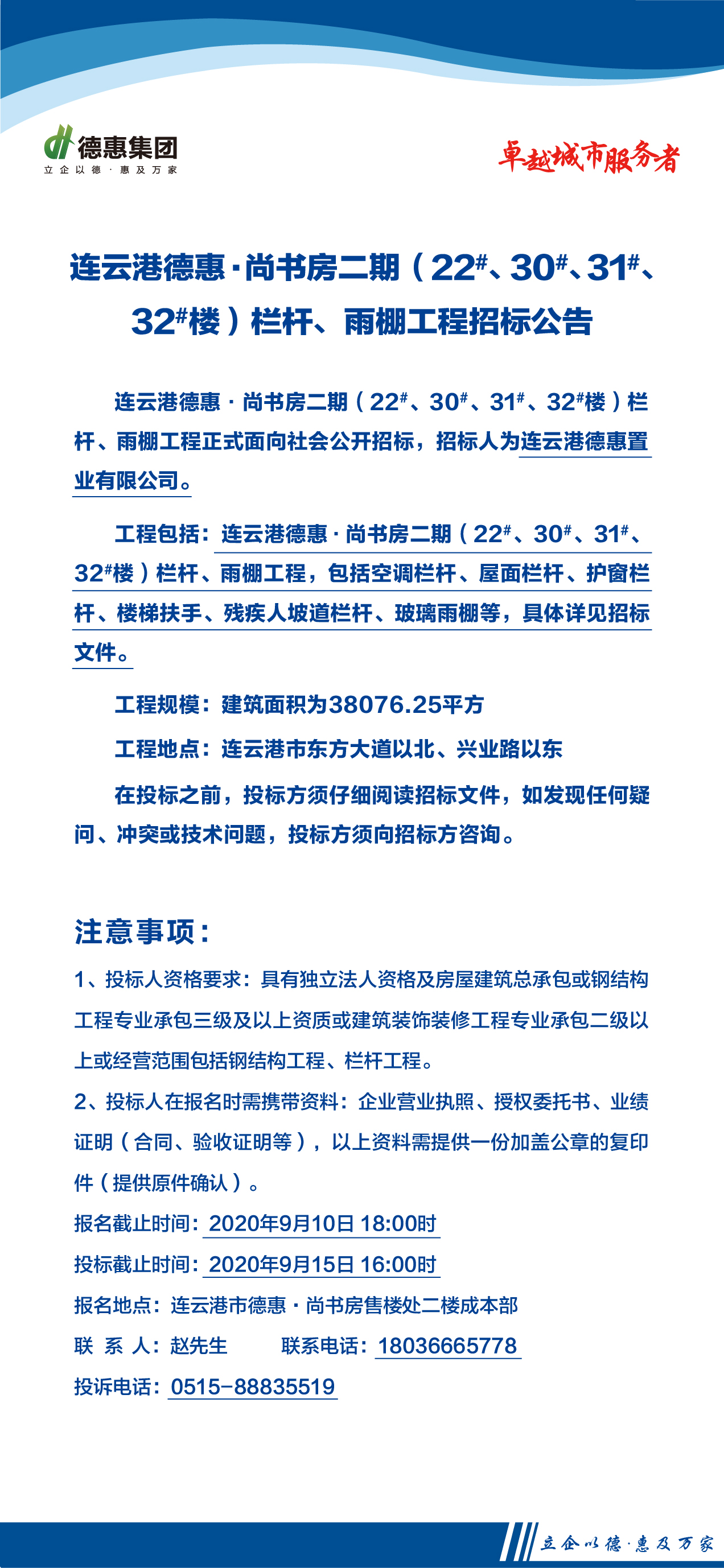 连云港德惠尚书房二期(22#、30#、31#、32#)栏杆、雨棚工程招标公告
