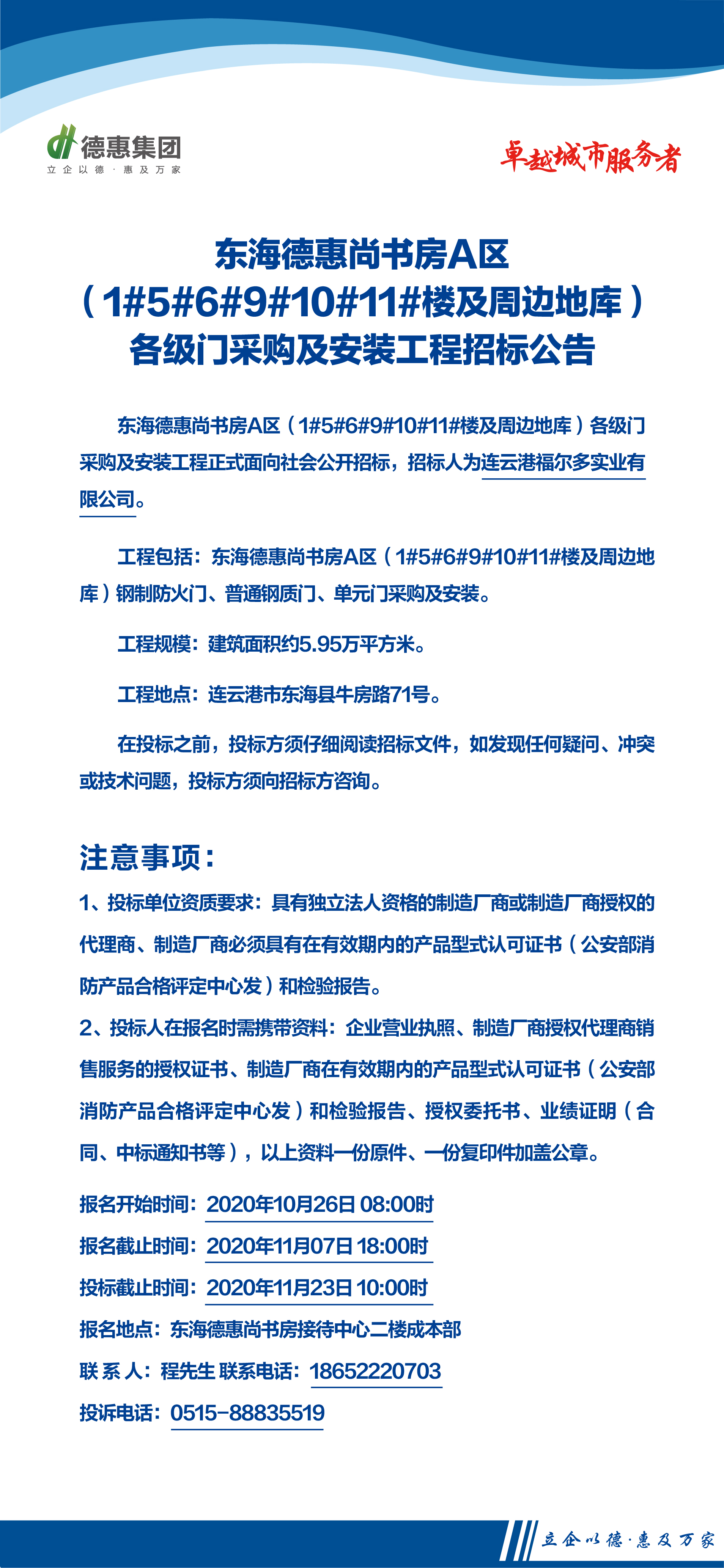 东海德惠尚书房A区(1#5#6#9#10#11#楼及周边地库)各级门采购及安装工程招标公告