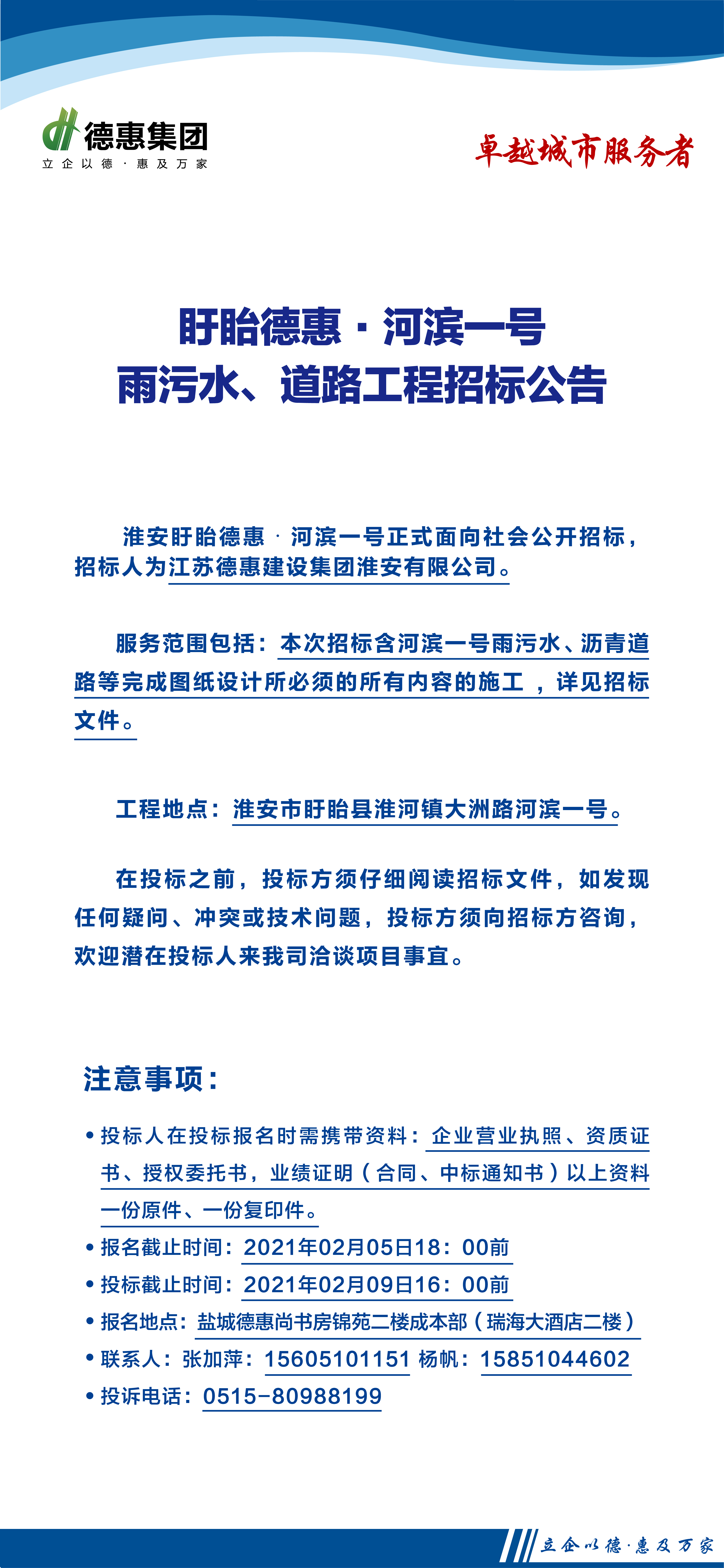 盱眙德惠·河滨一号雨污水、道路工程招标公告