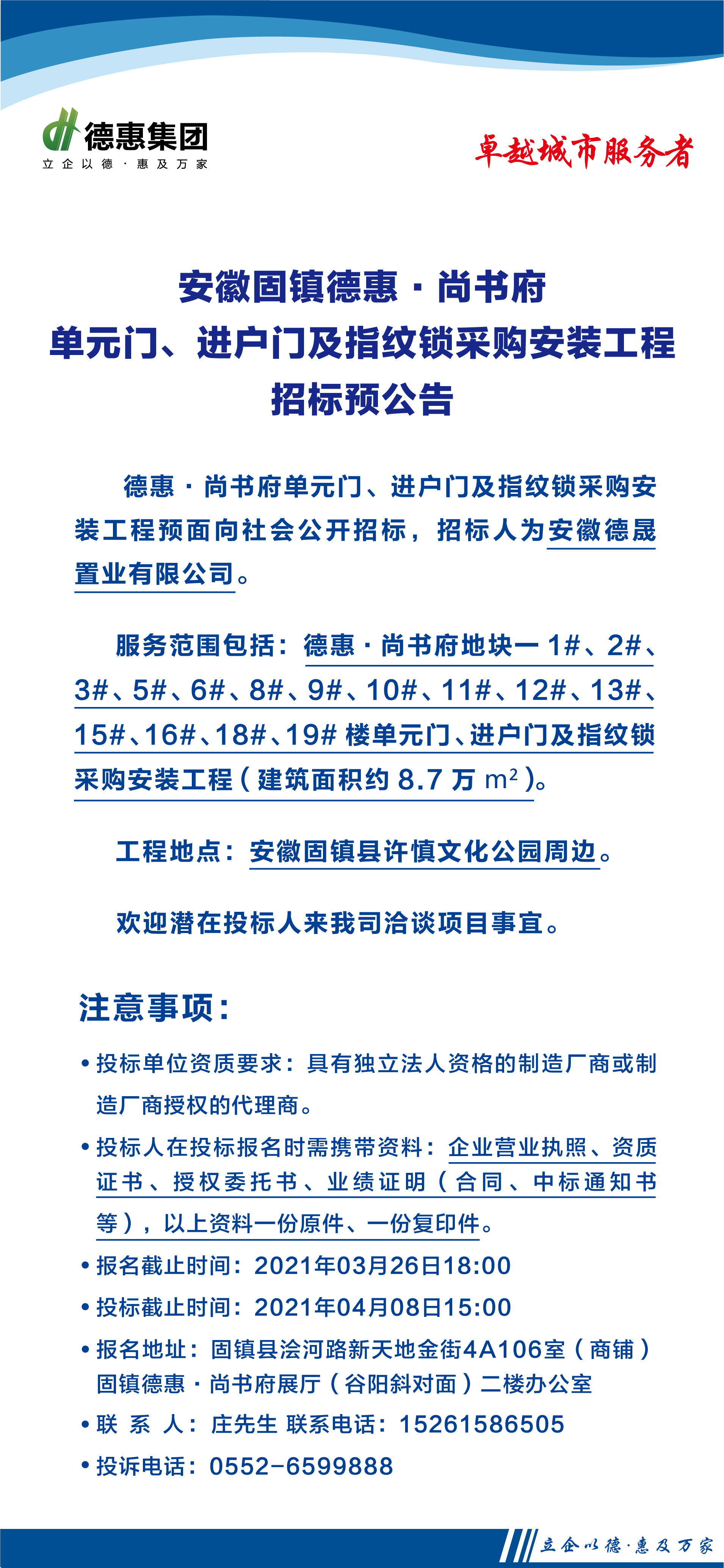 安徽固镇德惠·尚书府单元门、进户门及指纹锁工程招标预公告