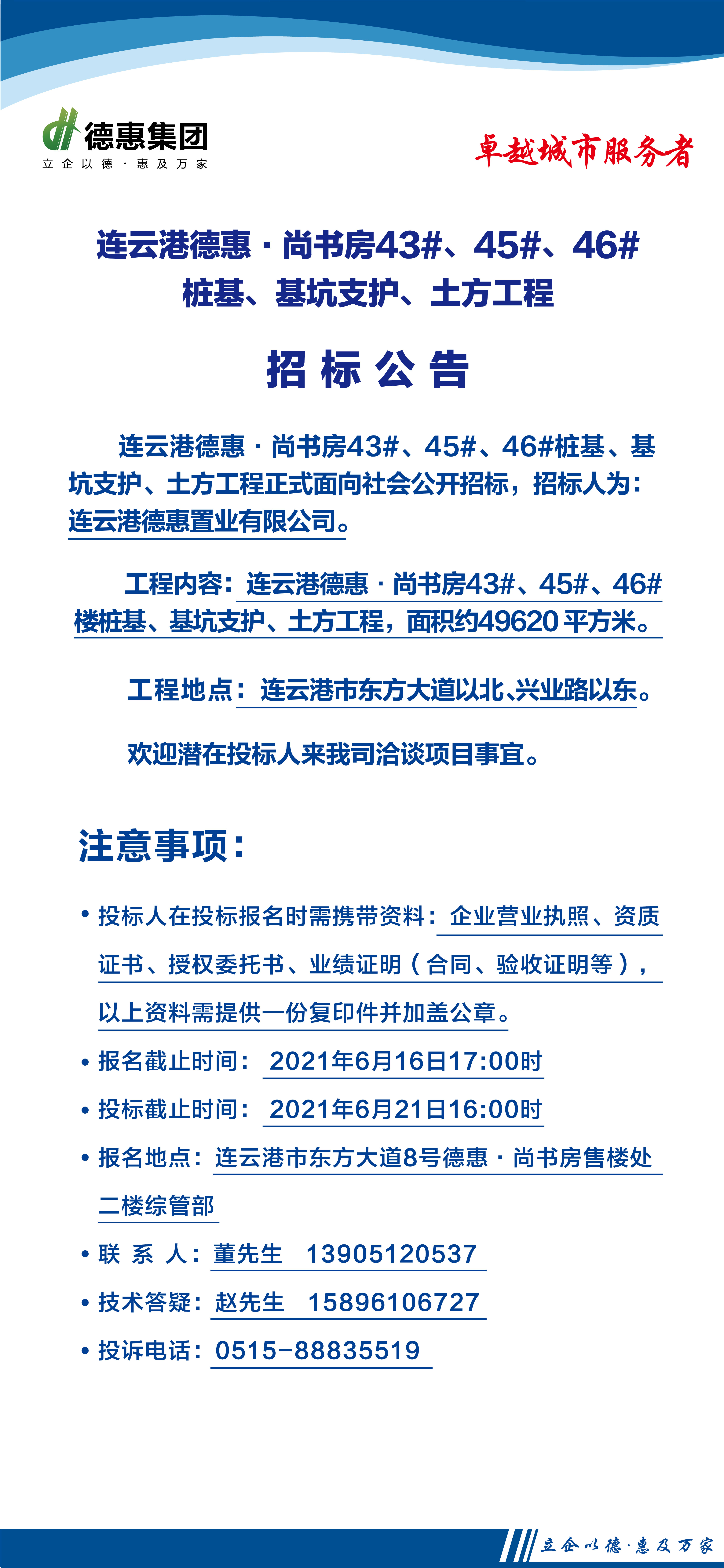 连云港德惠尚书房43#、45#、46#楼桩基、基坑支护、土方工程招标公告