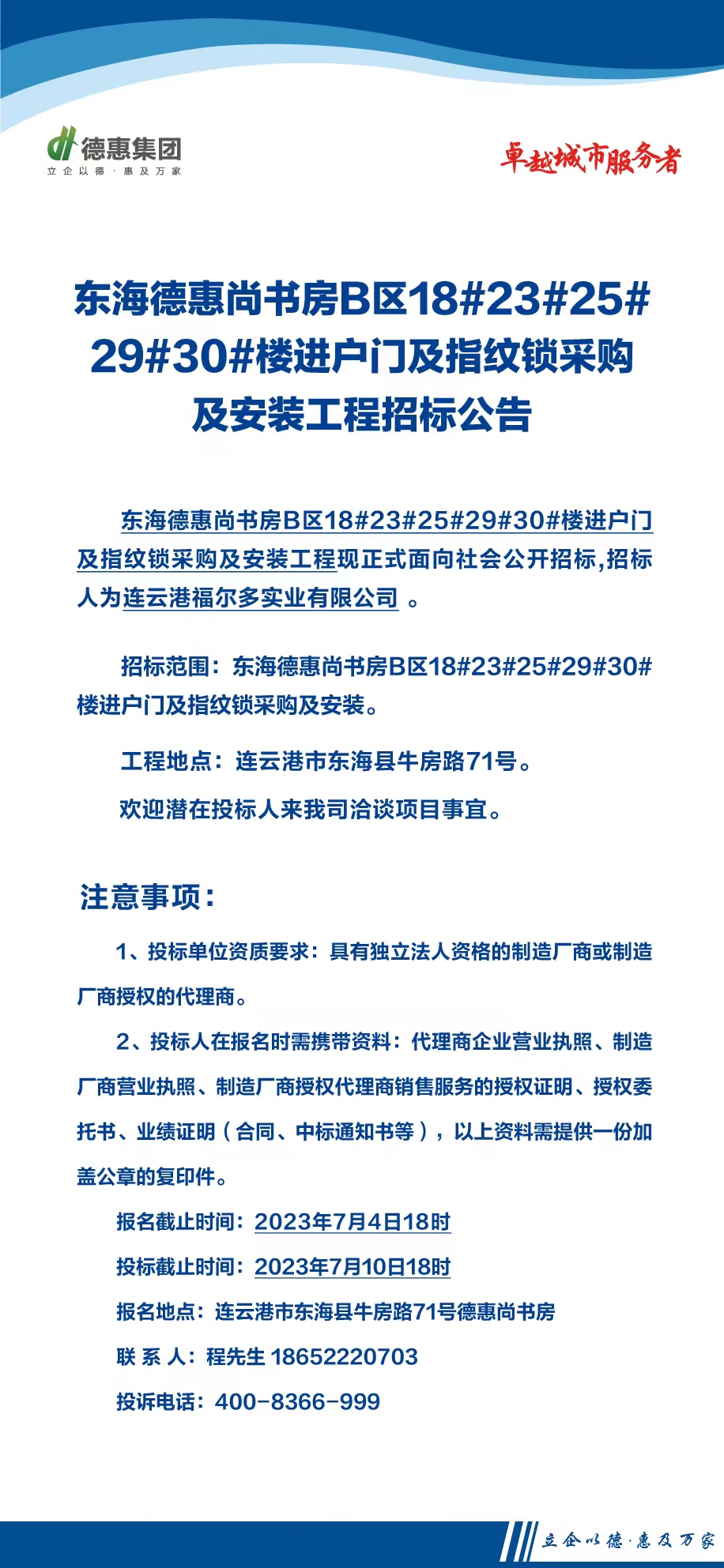 东海德惠尚书房B区18#23#25#29#30#楼进户门及指纹锁采购及安装工程