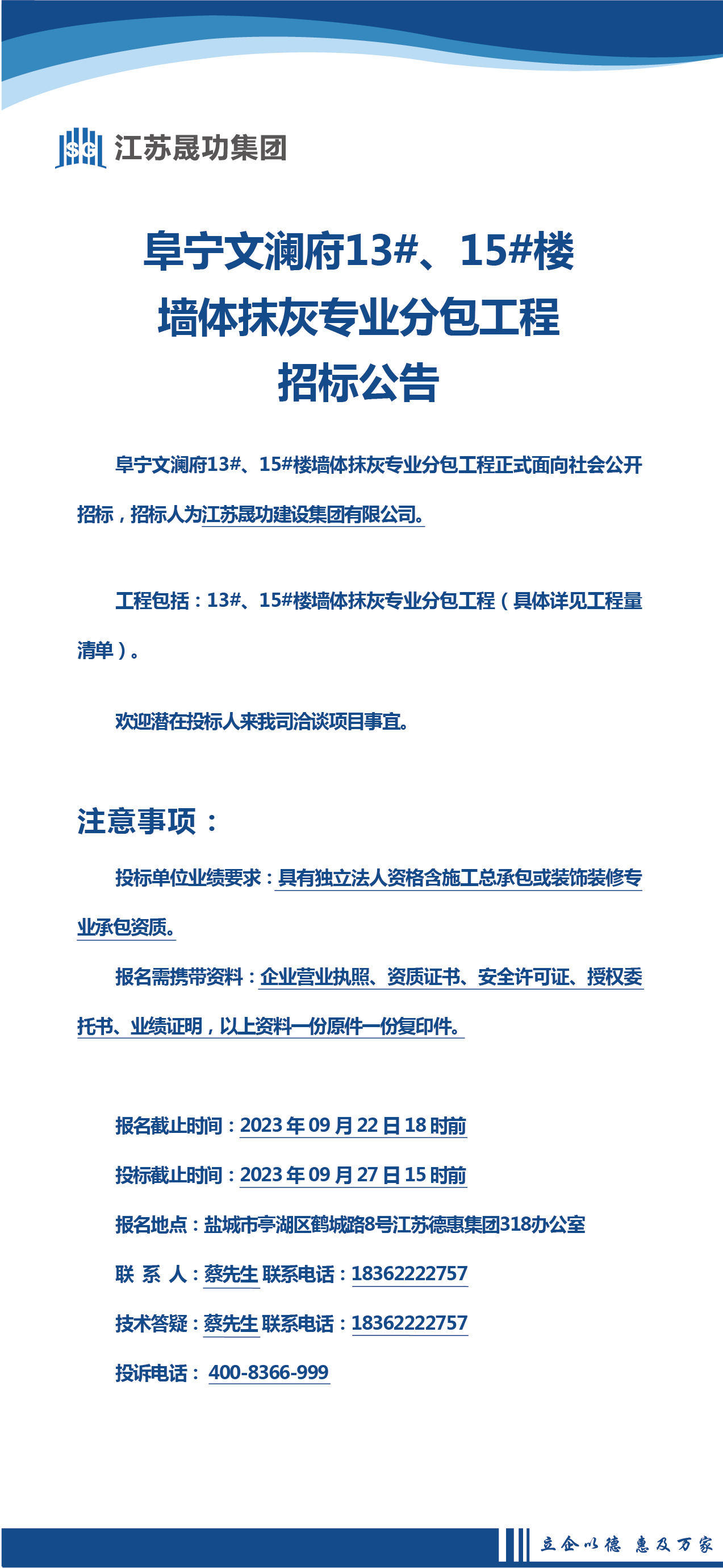 文澜府13#、15#楼墙体抹灰专业分包工程