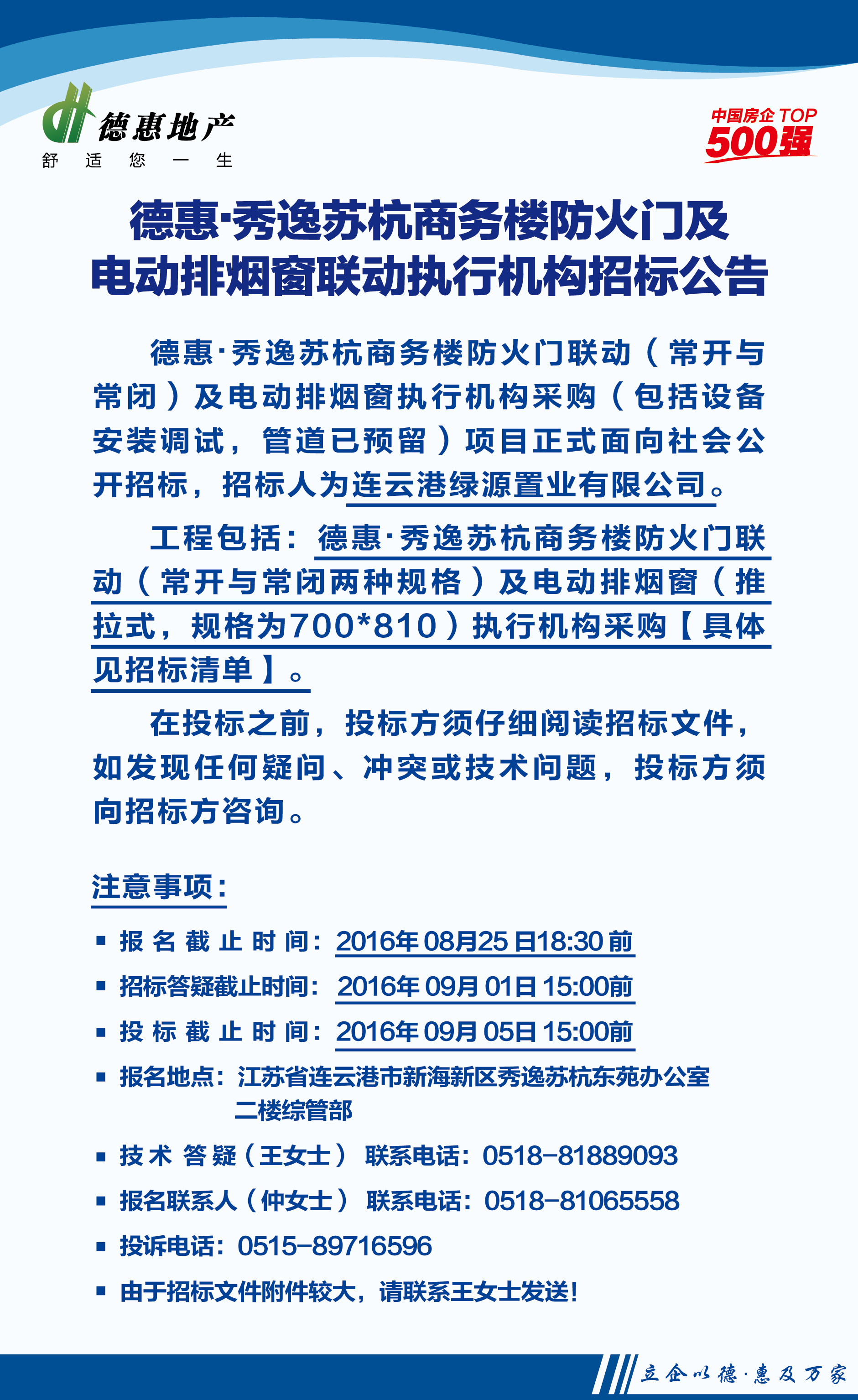 连云港秀逸苏杭商务楼防火门及电动排烟窗联动执行机构招标公告