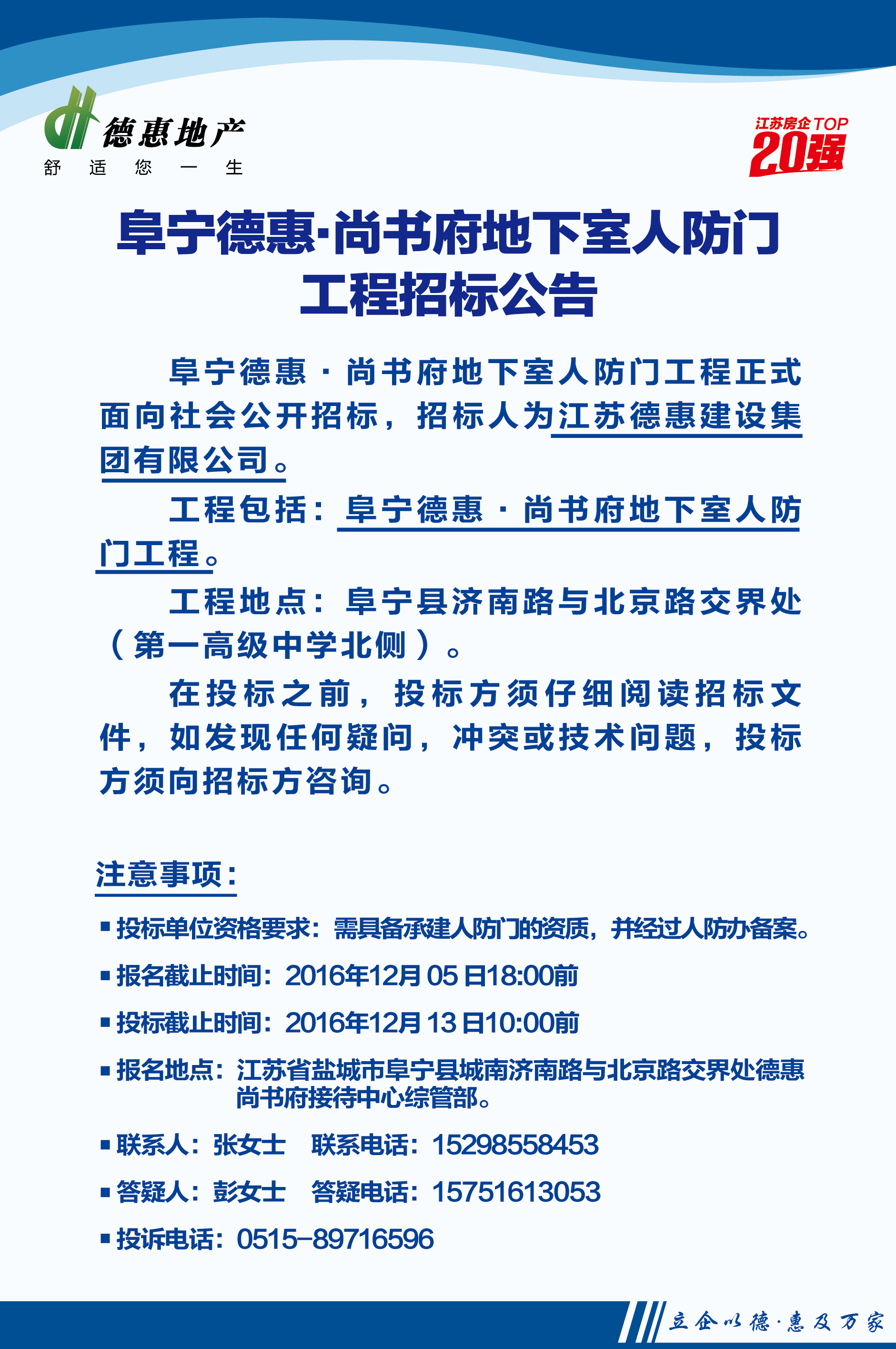 阜宁德惠·尚书府地下室人防门工程招标公告