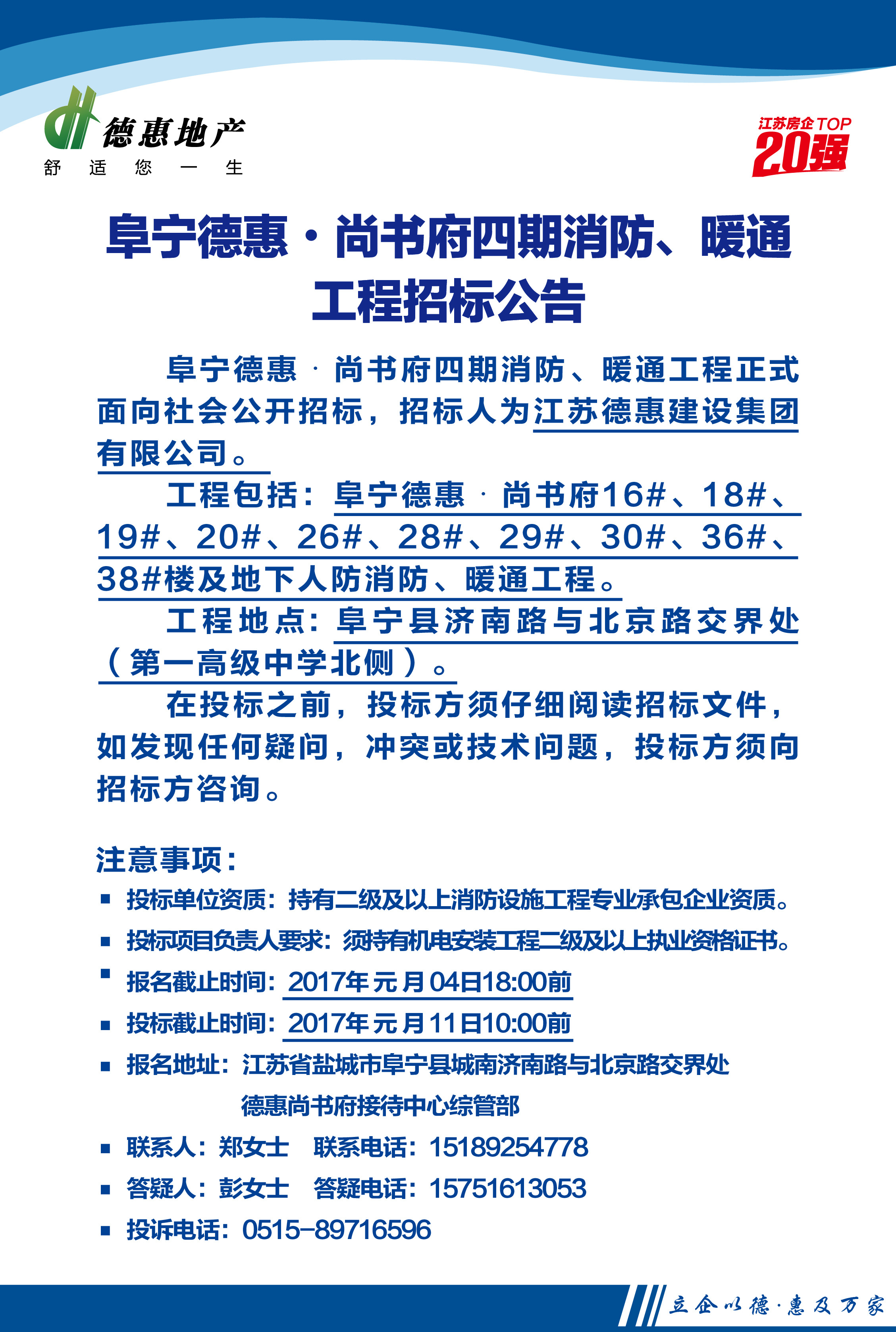 阜宁德惠•尚书府四期消防、暖通工程招标公告及文件