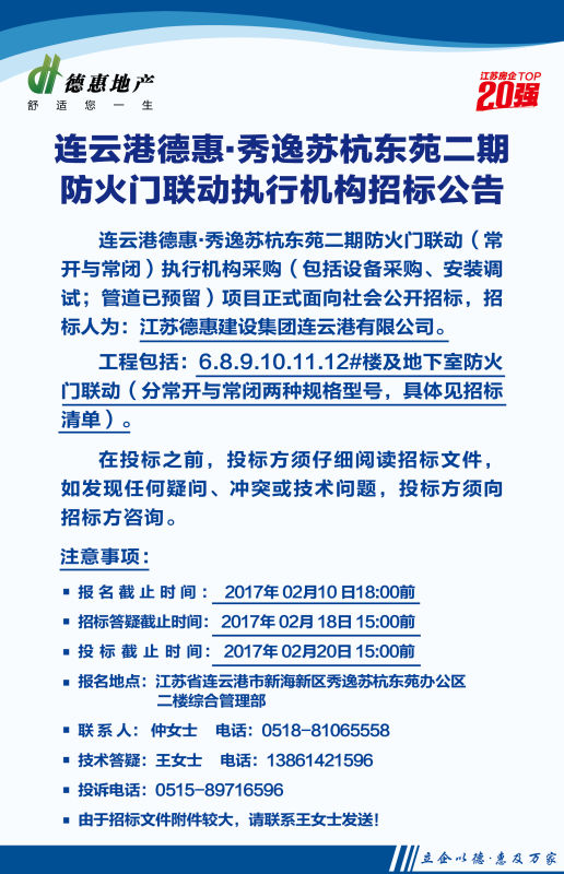 连云港秀逸苏杭东苑二期防火门联动执行机构招标公告及文件