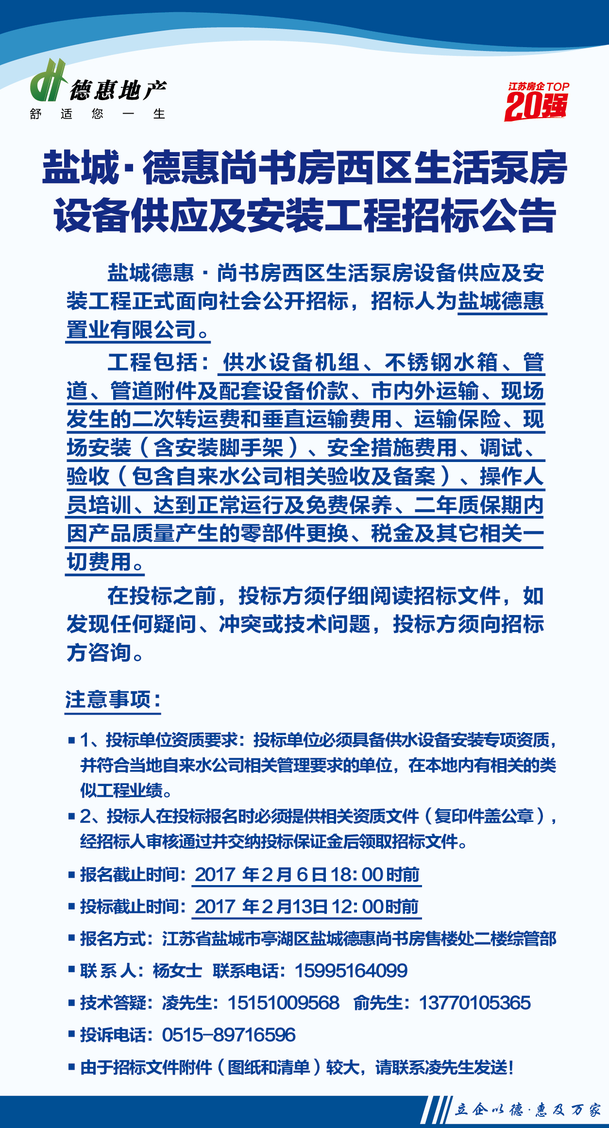 盐城德惠尚书房生活泵房设备安装工程招标公告及文件