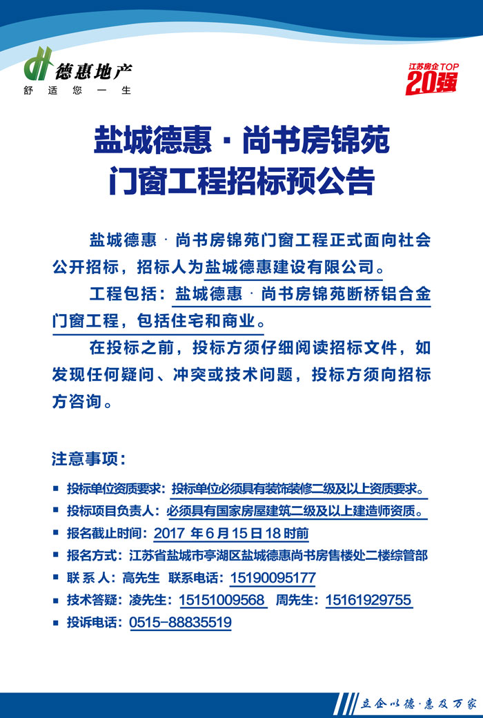 盐城德惠•尚书房锦苑门窗工程招标预公告