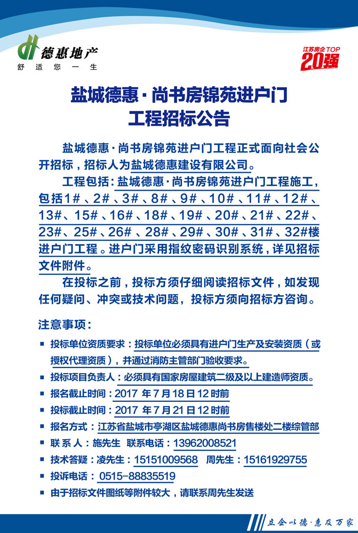 盐城德惠•尚书房锦苑进户门工程招标公告