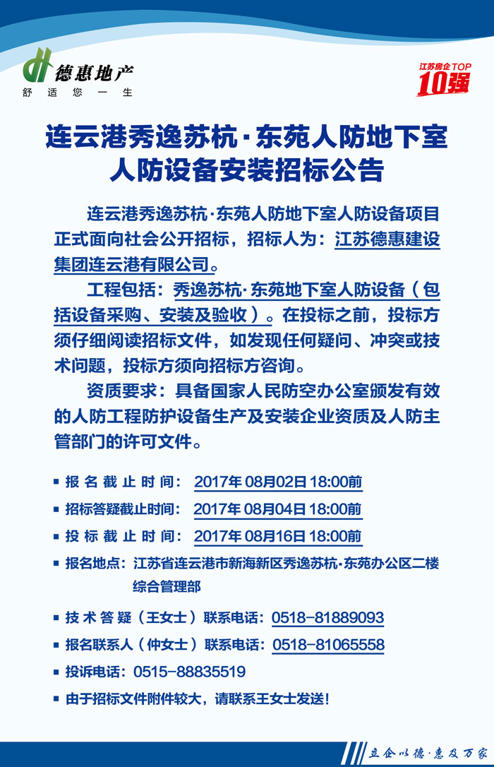 连云港秀逸苏杭·东苑人防地下室人防设备安装招标公告