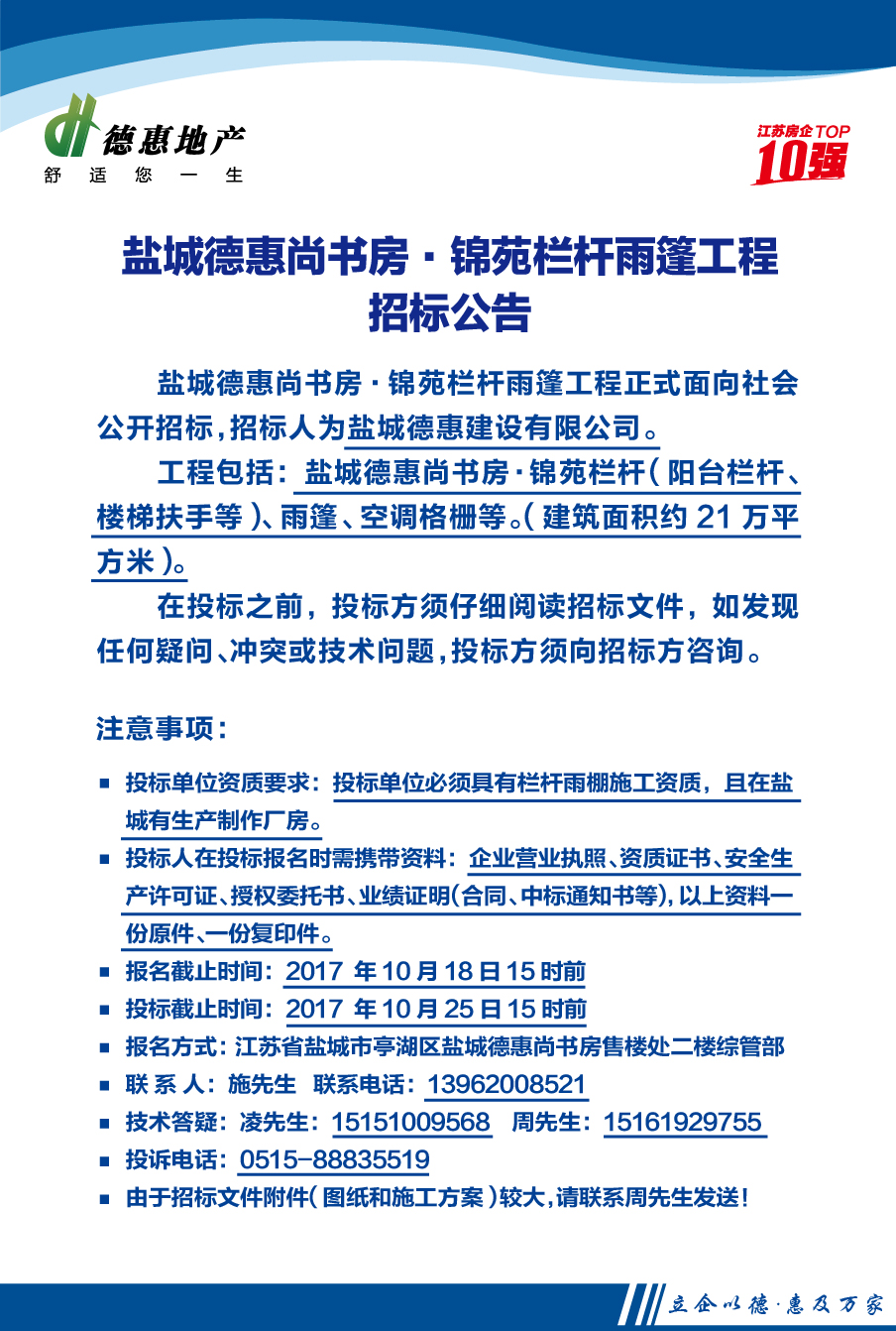 盐城德惠尚书房·锦苑栏杆雨蓬工程招标公告