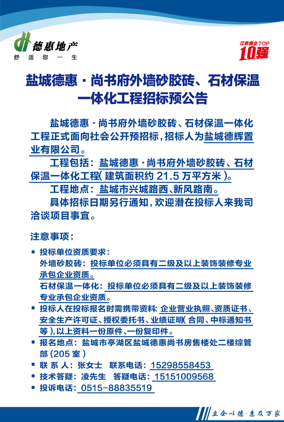 盐城德惠·尚书府外墙砂胶砖、石材保温一体化工程招标预公告