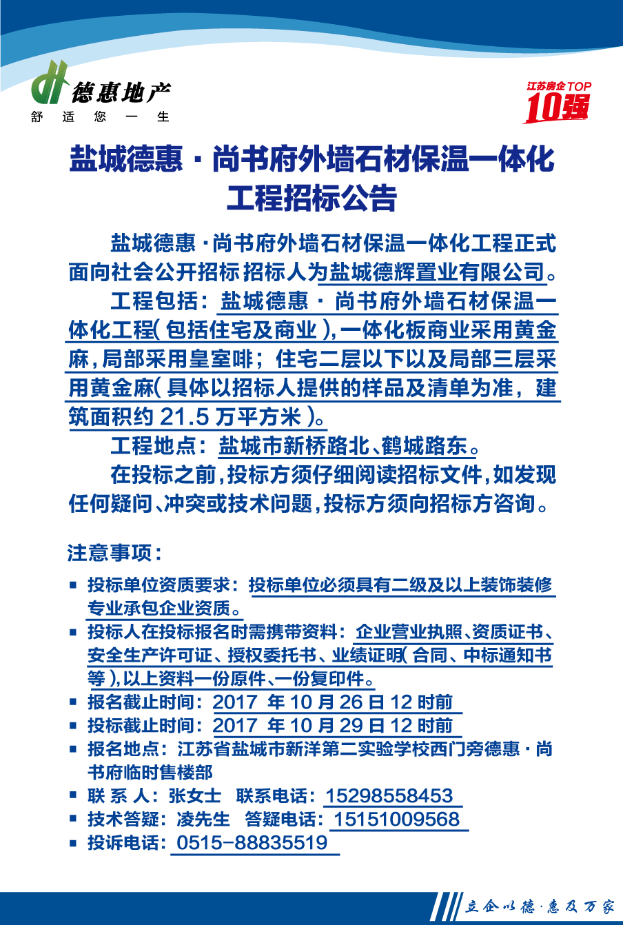 盐城德惠·尚书府外墙石材保温一体化工程招标公告