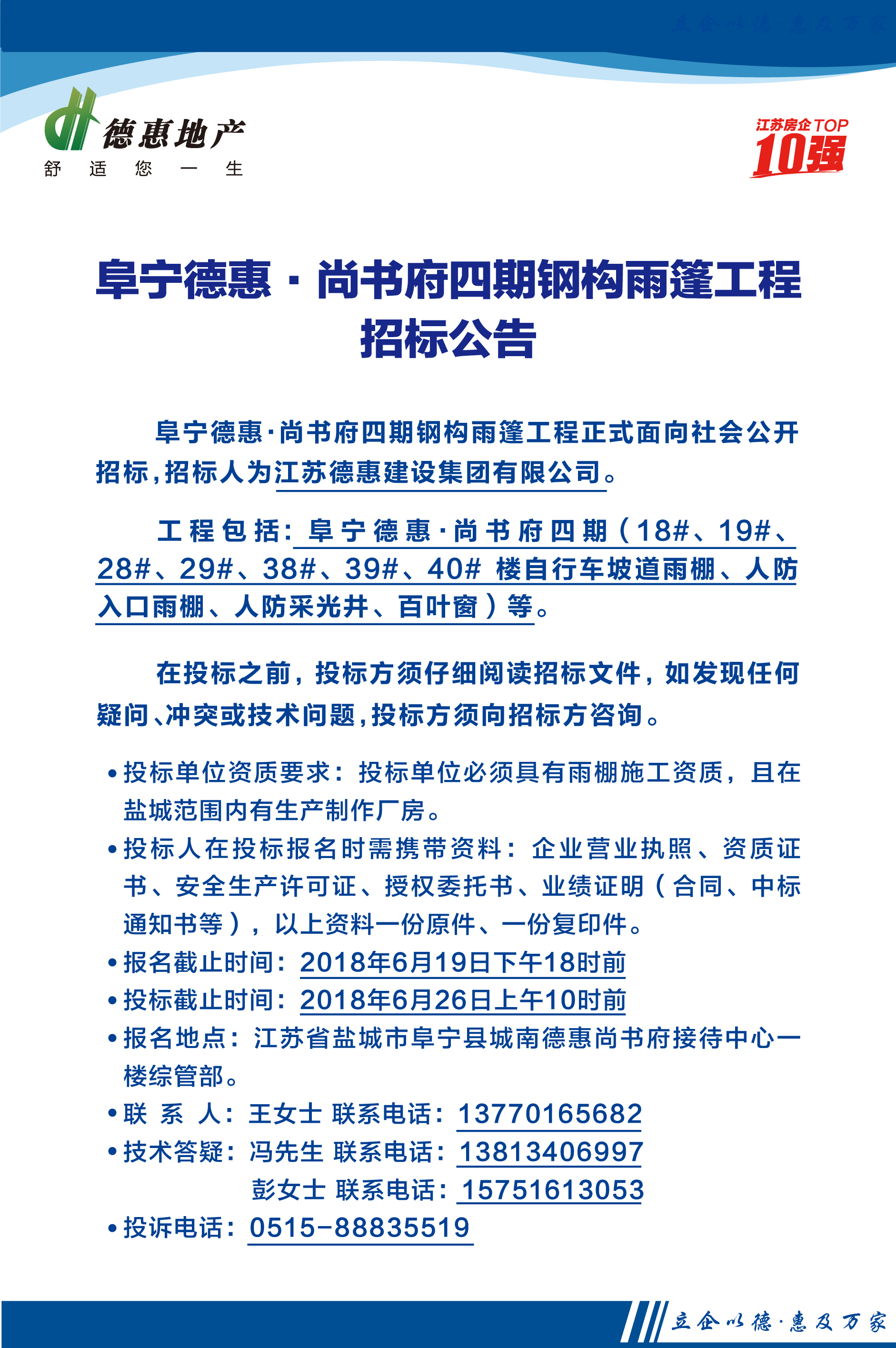 阜宁德惠·尚书府四期钢构雨棚工程招标公告