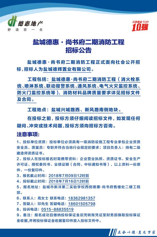 盐城德惠·尚书府二期消防工程招标公告