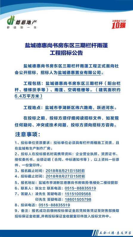 盐城德惠尚书房东区三期栏杆雨蓬工程招标公告