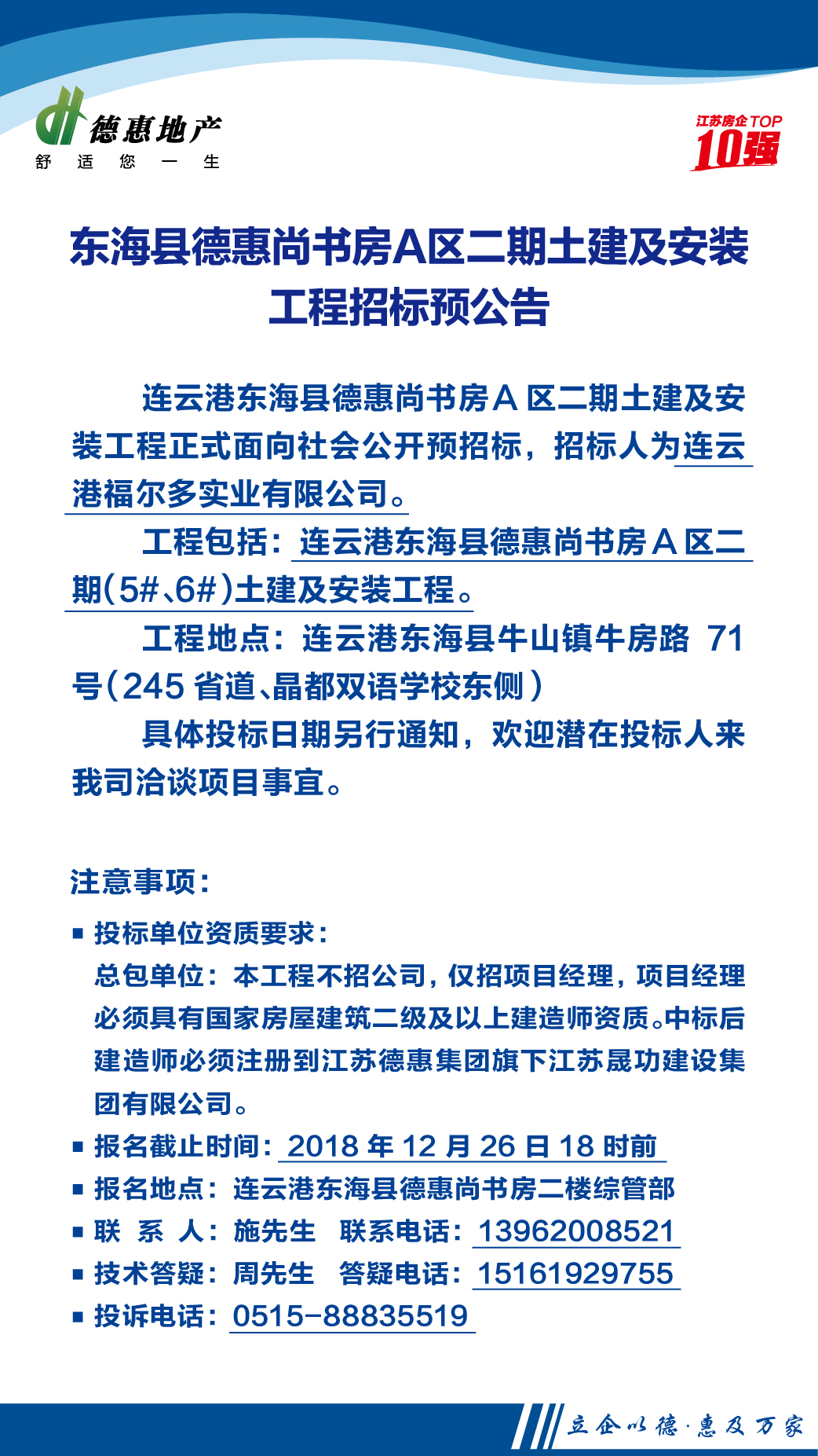 东海县德惠尚书房A区二期土建及安装工程招标预公告