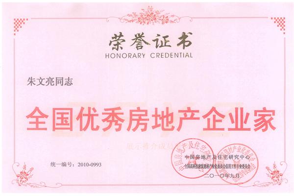 2010年9月,朱文亮同志 全国优秀房地产企业家