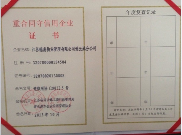 热烈祝贺江苏德惠物业管理有限公司连云港分公司荣获“重合同 守信用企业”称号!