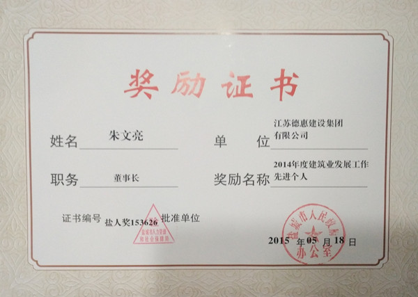 在2014年度盐城市建筑业发展工作考核评选中,我集团朱文亮董事长因其在建筑业的突出业绩,荣获“2014年度建筑业发展工作先进个人”称号。 市人民政府领导表示,希望全市建筑业广大干部职工以先进为榜样,以更加昂扬的斗志、更加勤勉的作风,加快建筑业转型升级,推动建筑产业现代化,进一步推进建筑强市建设,为“建设新盐城、发展上台阶”作出新的更大的贡献。 |