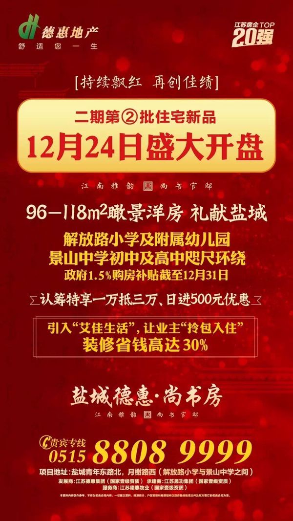 项目过硬的建筑品质先后获得省市各级政府部门的嘉奖。2016年2月,盐城德惠尚书房项目荣获盐城市亭湖区人民政府颁发的建筑业工作“创省级标准化示范工地”奖项。2016年8月,德惠集团晟功建设与400多家强劲的对手企业激烈角逐评比后,位列盐城市建筑企业信用评价前四强! 德惠集团全体人员未来将再接再厉,持续狠抓现场文明施工,以优质的质量管理、先进的施工技术为保障,为盐城父老乡亲打造更多精品之家。 新品开盘在即,火爆认筹中 为回馈家乡父老的厚爱,盐城德惠·尚书房二期第二批住宅新品将于 12月24日盛大开盘,现正火爆认筹中,诚邀父老乡亲莅临品鉴!