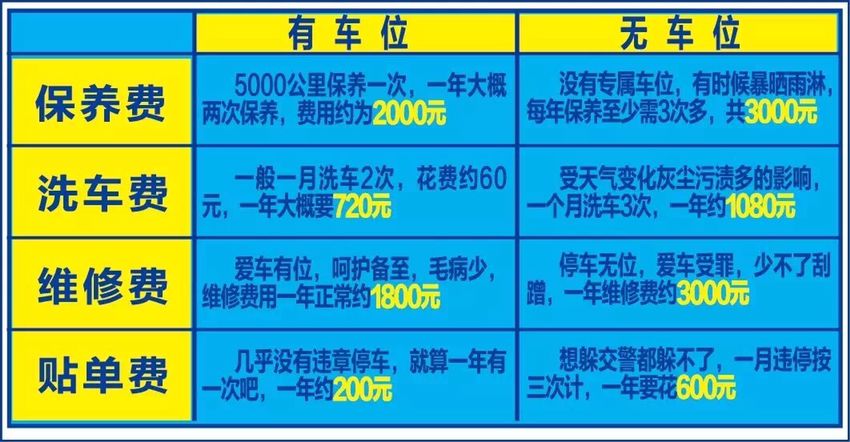 以某小区车位为例:购买车位费用8万元,每月交40元的车位管理费,30年管理费累计1.44万元。共计8万+1.44万=9.44万元。平均1年的费用=9.44万元/30年=3147元。 如果租车位,小区车位每月120元租金,按每5年月停车租金上涨100元算,共计(120+220+320+420+520+620)×12×5=13.32万元。平均1年费用=13.32万元/30年=4440元。