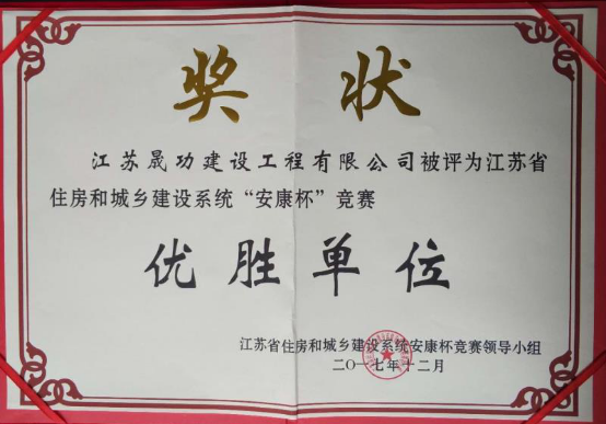 2017年,晟功建设按照“安康杯”竞赛活动的要求,从强化组织领导、营造活动氛围、加强安全管理、开展安全活动等方面入手,切实开展了各项安全工作,在防范安全事故、防治职业病等方面取得了良好效果,获得了由江苏省住房和城乡建设系统组织开展的2017年度“安康杯”竞赛活动 “优胜单位”的荣誉称号。 本次竞赛活动的开展为晟功建设的安全卫生管理水平和职工安全健康意识提高起到了积极的作用,进一步提高了广大员工的职业安全卫生意识与自我保护技能,营造了安全稳定、健康和谐的工作氛围,为晟功建设稳步发展创造了良好的生产环境。 |