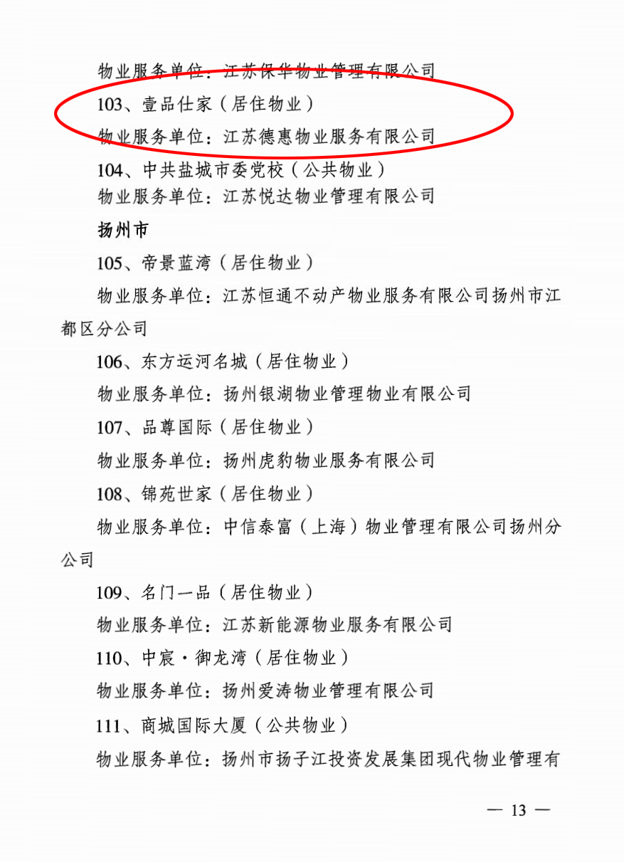 近日, 江苏省住房和城乡建设厅发布284号文公布了2017年度江苏省省级示范物业管理项目名单,盐城市阜宁县德惠·壹品仕家榜上有名。多年来,江苏德惠物业服务有限公司一直秉承“让生活更舒适”的服务宗旨,从每一个细微处出发,为客户打造舒适的品质生活。获此殊荣,寓意着德惠物业将朝着更高的台阶迈进! 壹品仕家小区被评为“2017度省级示范物业管理项目”