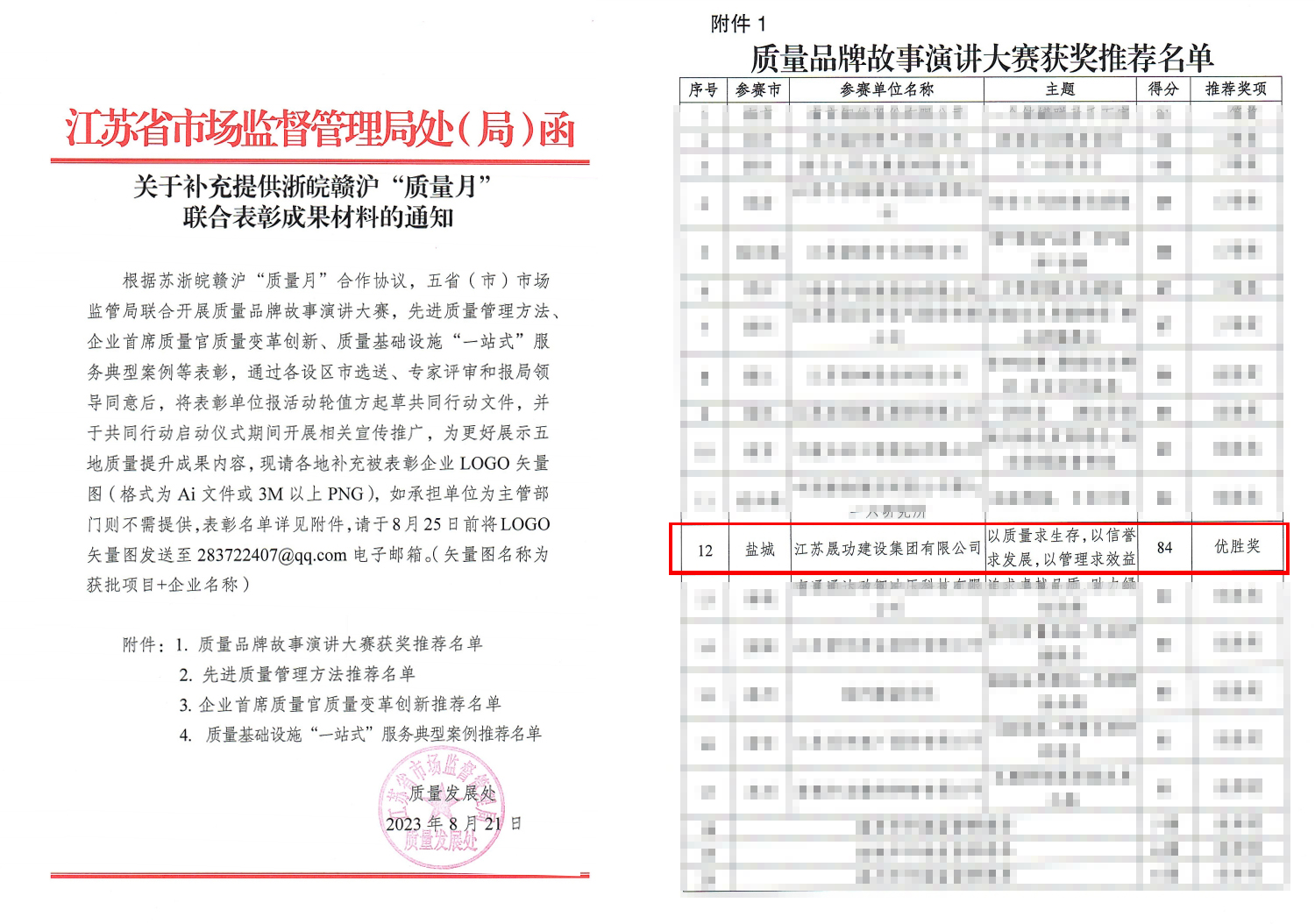 根据2023年苏浙皖赣沪“质量月”共同行动安排,苏浙皖赣沪四省一市市场监督管理局决定在全国“质量月”期间联合开展先进质量管理方法评选、质量品牌故事演讲大赛视频推荐发布活动。江苏晟功集团凭借《以质量求生存,以信誉求发展,以管理求效益》的品牌故事大赛演讲视频,获得2023年苏浙皖赣沪“质量月”质量品牌故事演讲大赛优胜奖。