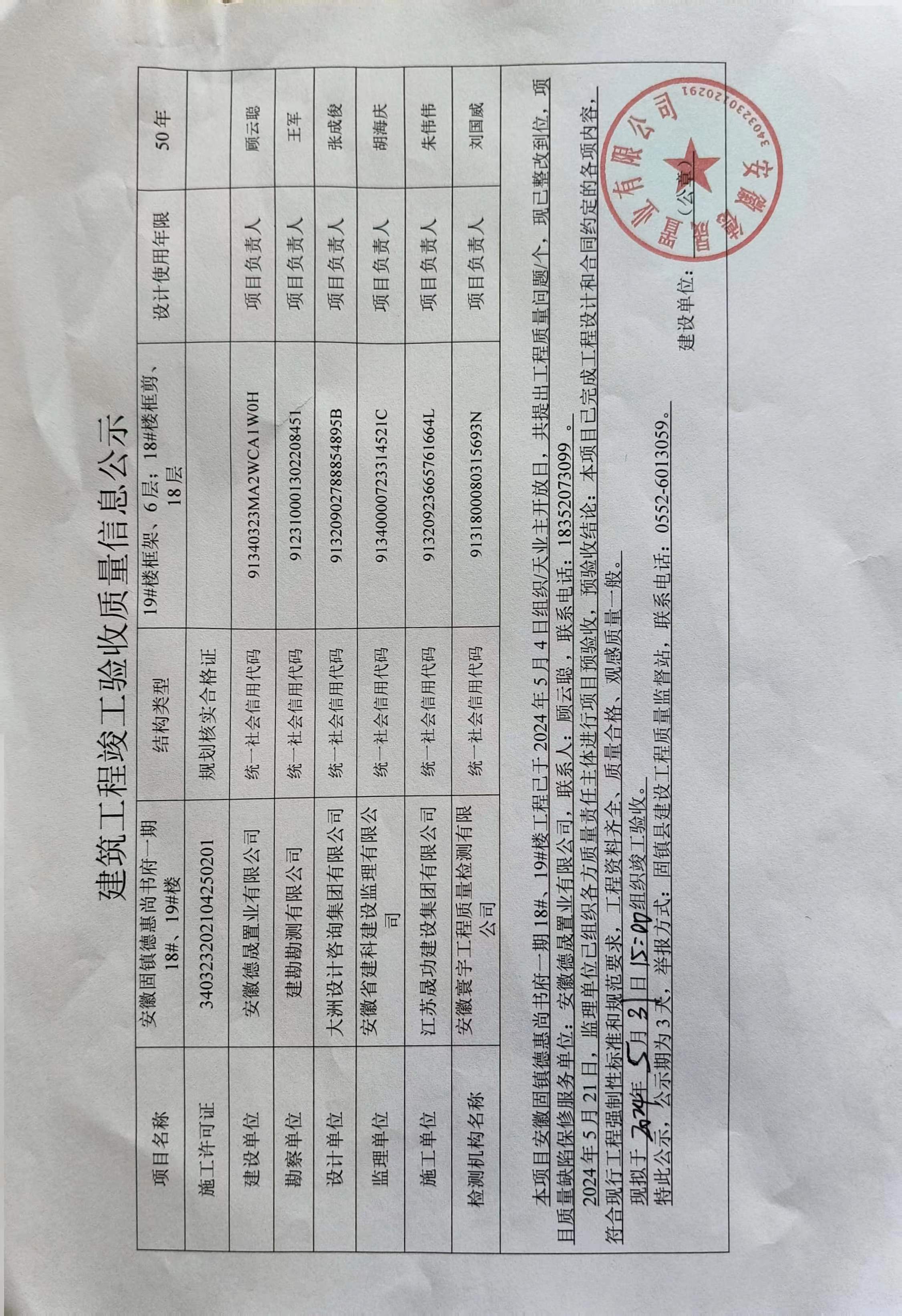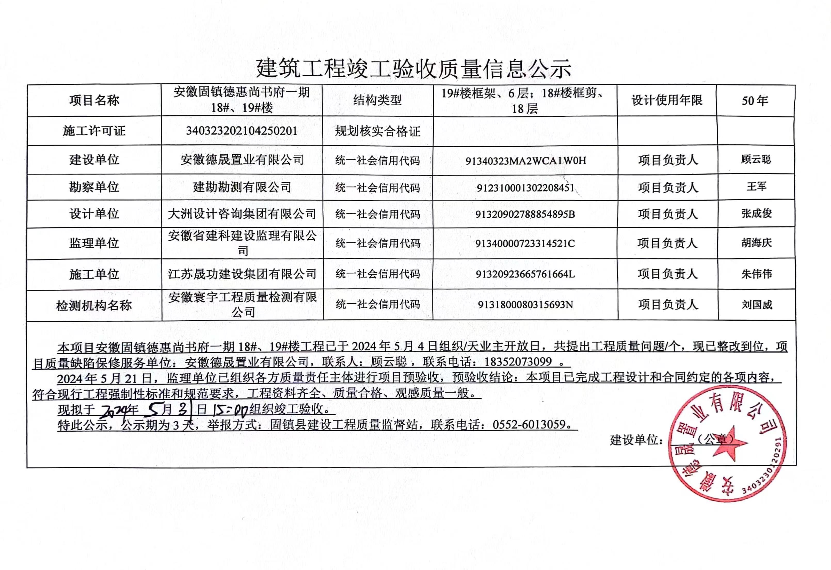 安徽固镇德惠尚书府一期18#、19#楼建筑工程竣工验收质量信息公示