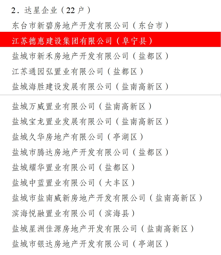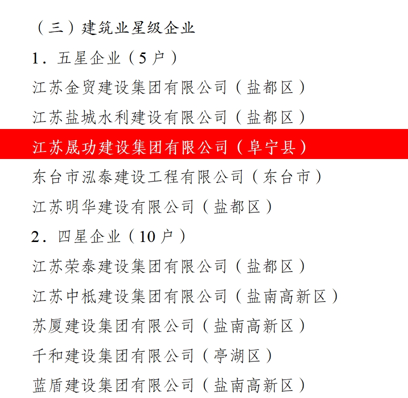 近日,中共盐城市委办公室公布了盐城市2024年度星级企业认定名单,江苏晟功建设集团有限公司获评江苏省盐城市“争星创优”建筑业五星企业认定;江苏德惠建设集团有限公司获评房地产“达星企业”认定。