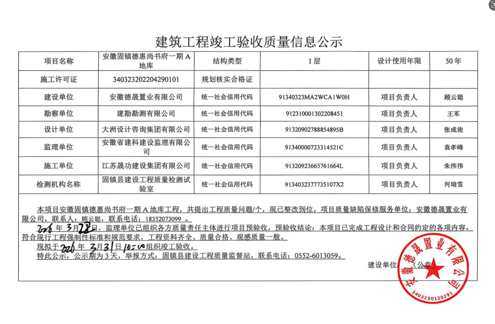 安徽固镇德惠尚书府一期A地库工程竣工验收质量信息公示